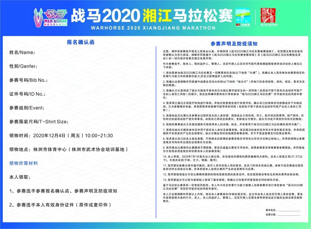 3、參賽者需攜帶本人二代身份證原件/復印件、到物品發放處簽署《報名確認函》、《參賽聲明及防疫須知》后,方可領取物資。