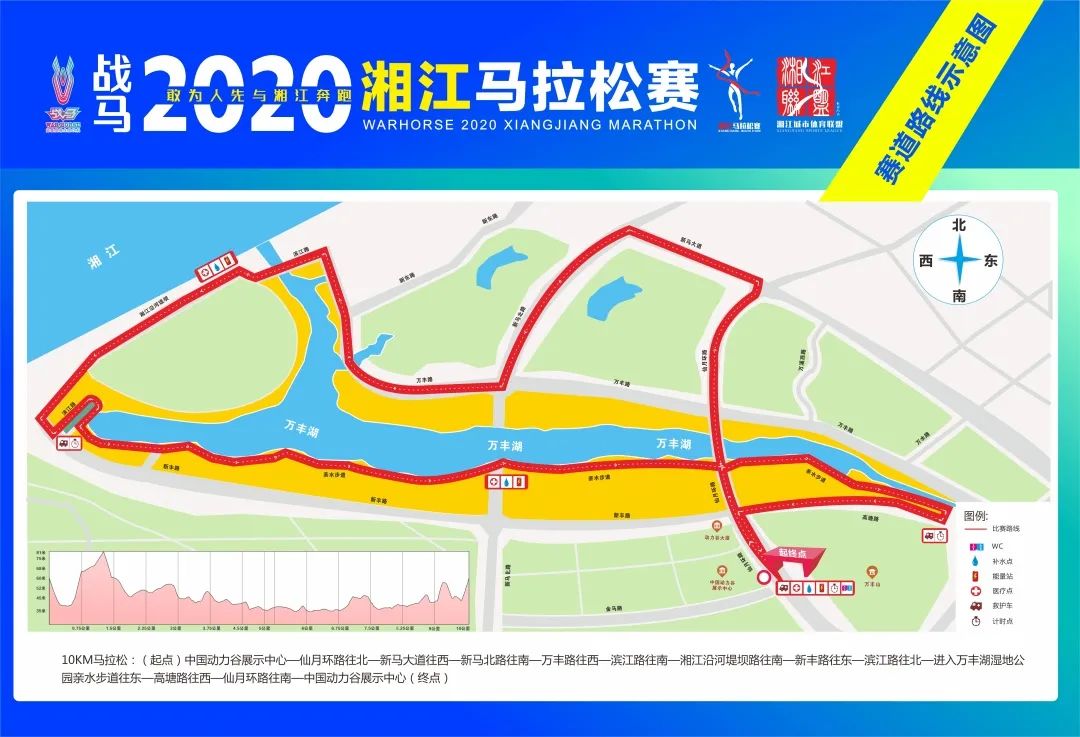 湘江沿河堤壩路—萬豐湖休閑步道(約4.7KM-9KM)處賽道收緊,請各參賽選手途經以上路段時注意緩行,切勿擁擠。